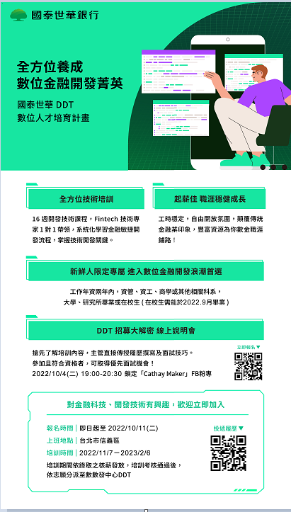 國泰世華銀行職缺宣傳-DDT數位人才培育計劃(10/11截止)